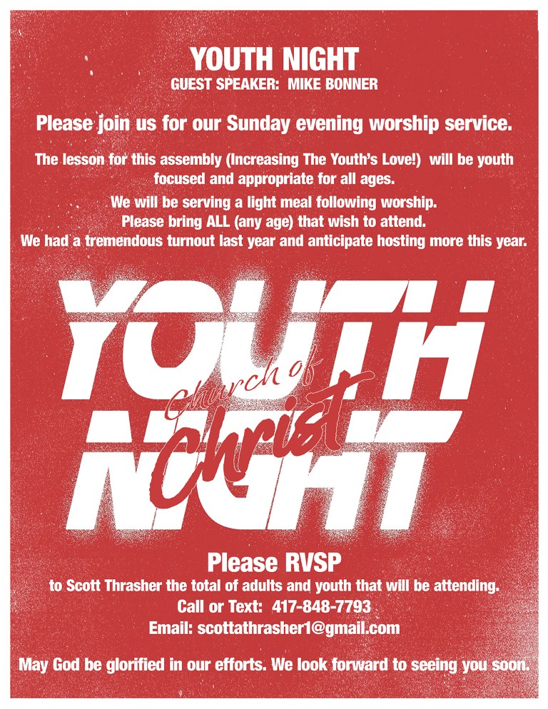 1700 S Jefferson Ave Aurora, MO 65605 Aurora Church of Christ Directions Youth Night Date March 15, 2026 Time 5:00 pm Category Youth